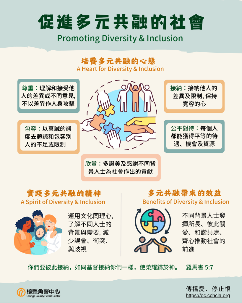 多元共融的社會是由具有不同文化、種族、宗教、年齡、性別、能力等人群所組成的社會。所有成員在彼此接納與尊重的基礎上互相包容與學習,一起建立更和諧與穩定的社會。