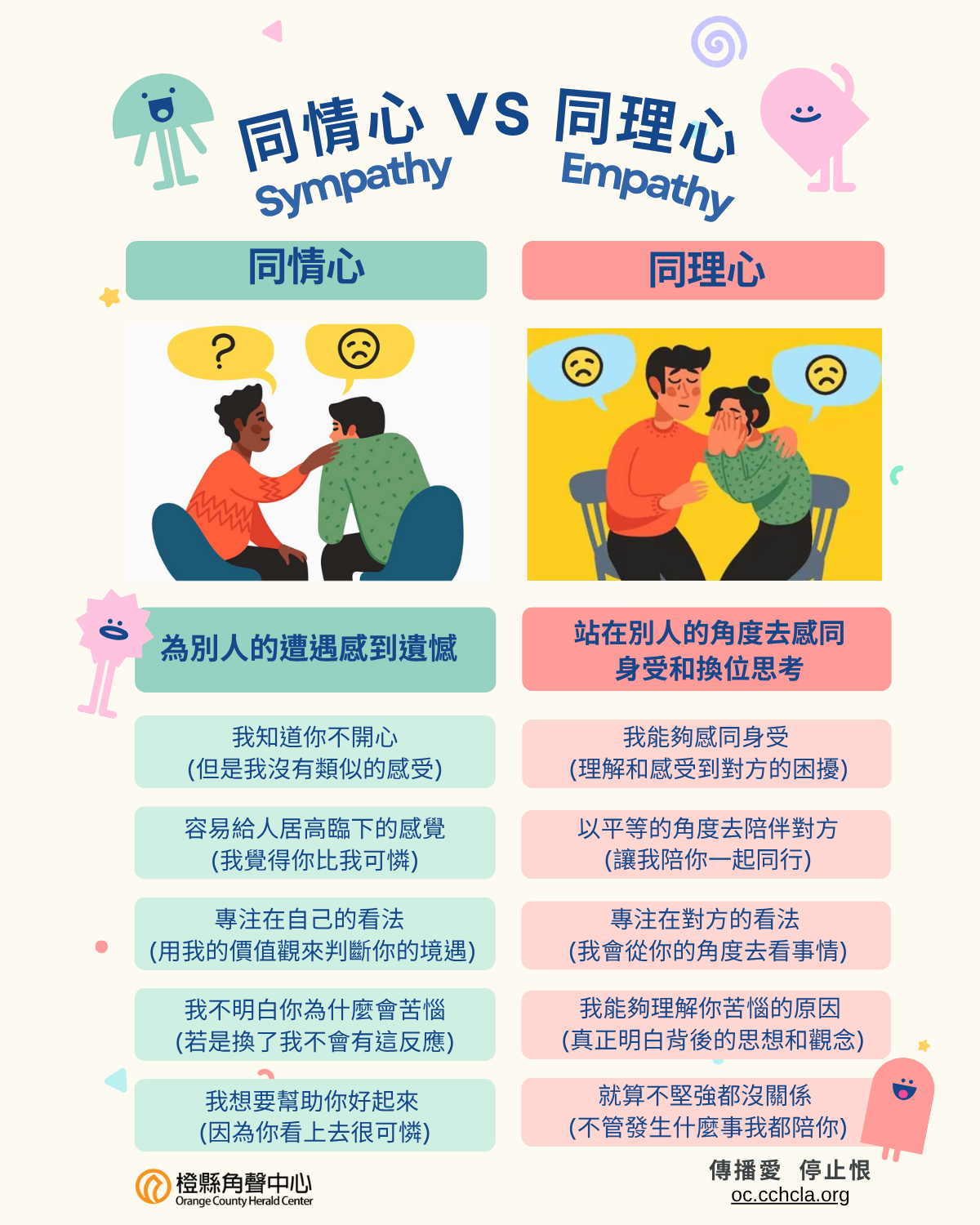 同理心與同情心的差別 November 9, 2023 / 心理健康知識與技能 / mental health 很多人面對困難時會對親友說 “ 我不需要你同情我,我只需要你理解我、陪伴我! ”到底這句話是什麼意思?我們可以從一個可愛又幽默的3分鐘動畫片來理解同理心跟同情心有什麼不同?如何將同理心付諸實行? 欲了解更多我們發佈的訊息請瀏覽橙縣角聲 FACEBOOK:https://www.facebook.com/ocherald/ (中文)https://www.facebook.com/OCHC.YIA/ (English)