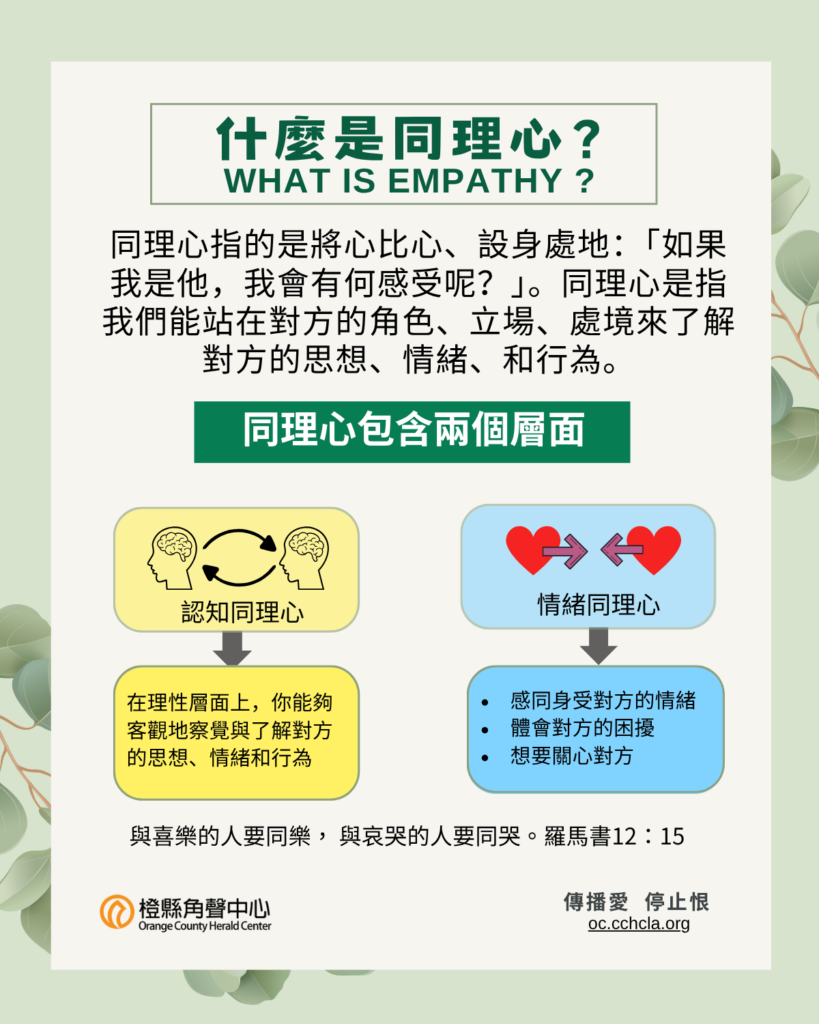 親愛的橙縣角聲之友:根據科學研究顯示,同理心不僅是人際關係中情感連結的必要元素,也同時促進關係裡雙方的個人心理健康。 讓我們一起來學習明白“同理心是什麼?”