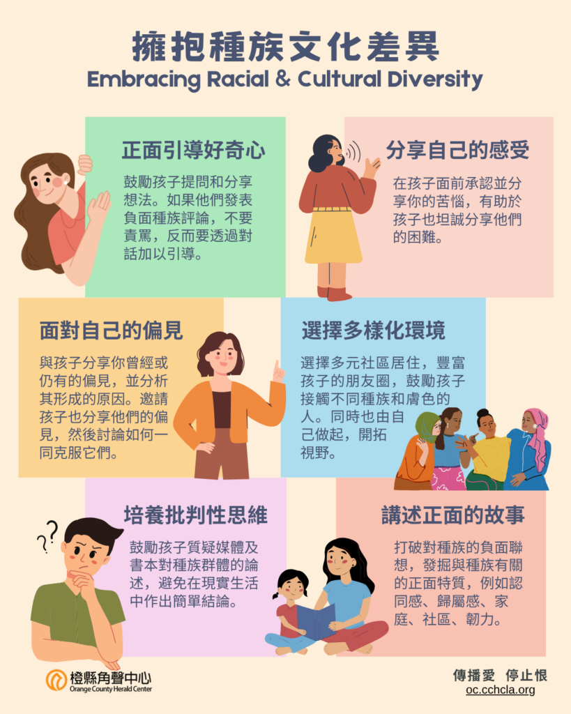擁抱種族文化差異 March 12, 2026 / 傳播愛、停止恨 / stop the hate 研究發現,嬰兒出生後幾個月內,已經會區分膚色,且會傾向親近同種族的臉。這意味著他們的小腦袋裡已存在種族差異的意識;也意味著,要在他們被這世界影響而產生成見之前,培育他們成為擁抱文化差異的世界公民。如何及早和孩子開啟有關種族的對話?希望以下的信息圖表能幫助你。也歡迎閱讀這篇刋登在《號角月報》的文章:「擁抱種族文化差異」https://shorturl.at/pAPxb