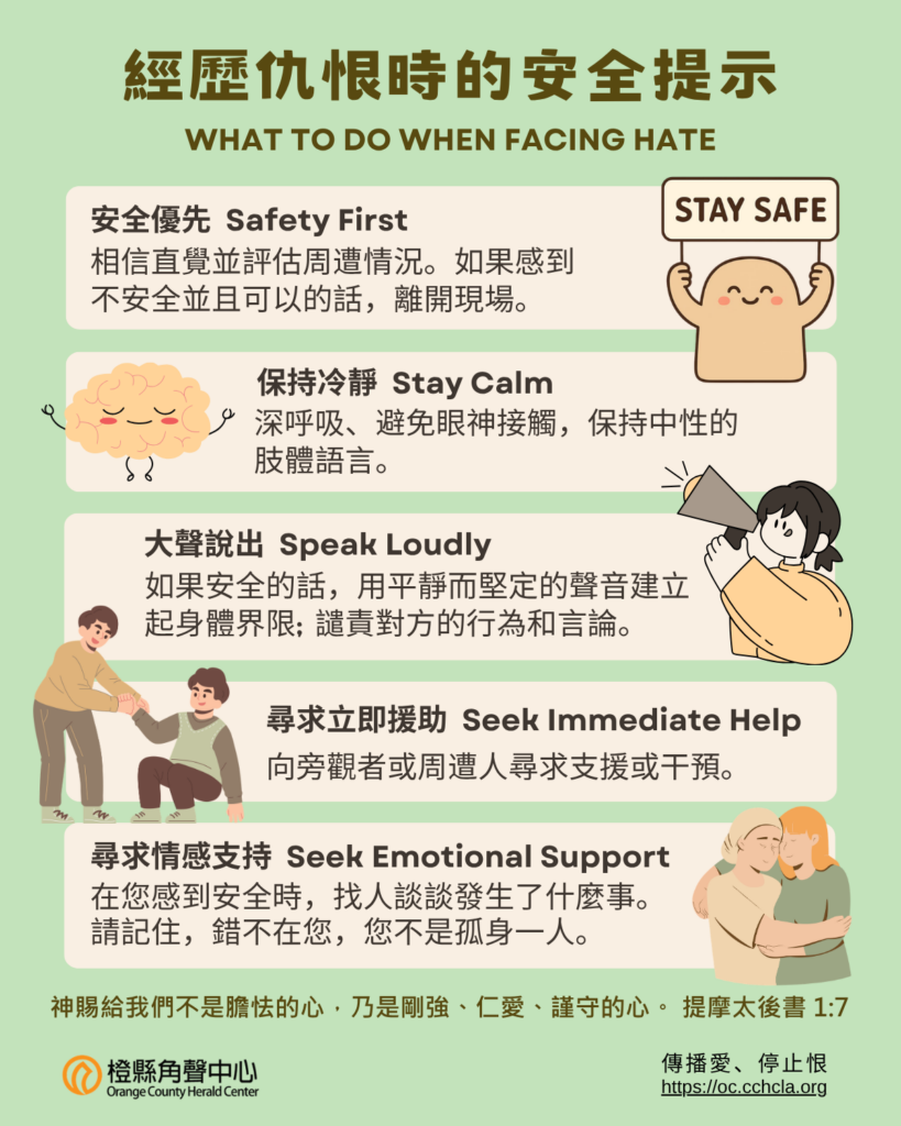 經歷被仇恨時的安全提示 March 7, 2026 / 傳播愛、停止恨 / stop the hate 種族仇恨是人類共通的罪性,我們不需要認為只有華人才會遭遇到被仇恨而覺得孤單和害怕。我們也需要學習經歷仇恨時不卑不亢的反應來減低如此負面經驗為自己帶來的創傷。