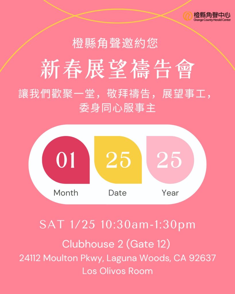 1/25/2025 新春展望禱告會 February 5, 2025 / Event Review 橙縣角聲事工團隊於1/25齊聚一堂,歡慶新春並同心委身於主的服事。詩歌敬拜後,主任分享各事工今年的展望與挑戰,並由同工見證神在事奉中的作為。接著大家為各事工同心禱告,求神帶領橙縣角聲透過更深入的社區參與和服務,以愛關懷弱勢,使福音觸動人心! 角聲南加州分會總監李偉強牧師也親自到來,以「傾倒生命,轉化心靈」為題勉勵大家,鼓勵同工透過關懷與陪伴,使人生命得以更新。最後大家同領聖餐,立志將生命獻上服事主。 當天同工們凝聚服事心志,深化彼此相愛的情誼,願意同心在神的恩典中前行,成為更有果效的福音器皿。