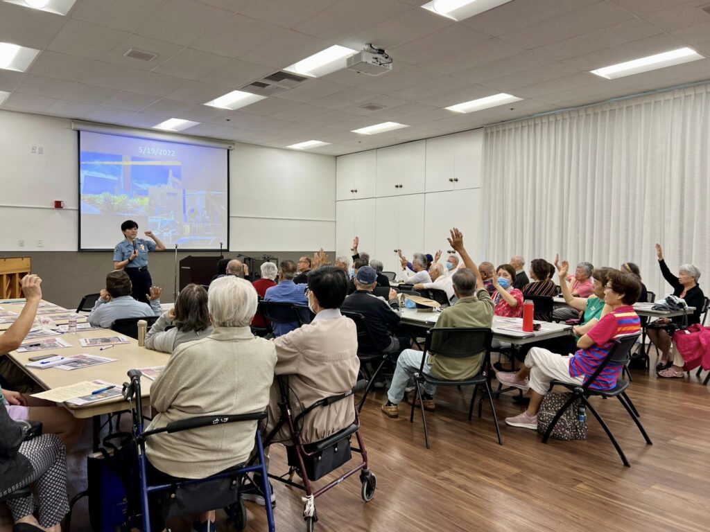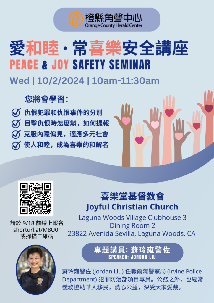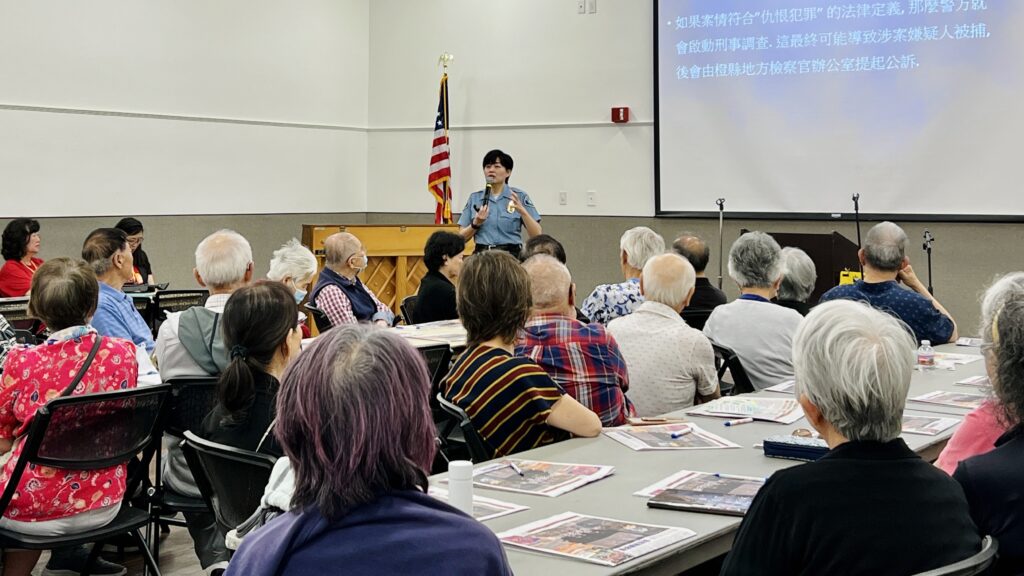 10/2/2024 ⟪愛和睦 • 常喜樂⟫安全講座 October 15, 2024 / Aged, 機構連結, 社區關懷, 近期活動 Latest Events / stop the hate 橙縣角聲於10/2與基督教喜樂堂合辦《愛和睦 · 常喜樂》安全講座,近60名居住於 Laguna Woods 和附近的長者聚首一堂,學習仇恨犯罪和仇恨事件的分別、目擊者的應變方法,以及如何克服無意識偏見,成為有福的「使人和睦者」。會中首次發表獻唱「傳播愛 · 停止恨」項目的主題曲《同一個天空》,歌詞說道:「在祂眼裡都寶貴,疼愛不分多少。」我們不分膚色種族,在同一個天空下,都是上帝所愛的!感謝爾灣警察局的支持,特派蘇玲雍警佐擔任專題講員,把沉重的話題以風趣生動的方式和大家分享。