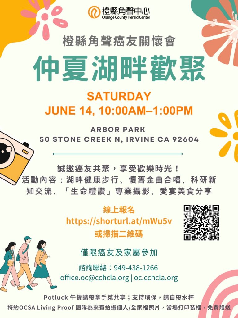 6/14/2025 橙縣角聲「仲夏湖畔歡聚」癌友關懷會 June 15, 2025 / Cancer, Event Review 6月14日 橙縣角聲舉辦了「仲夏湖畔歡聚」癌友關懷會,癌友與協工們彼此問候關懷,一起湖畔健走、歡唱、經驗交流,最後並享受豐盛的 Potluck 美食。當天OCSA Living Proof 團隊也為參加者及其家人拍攝紀念照,留下美好回憶。感恩主賜福成就美好的聚會,舊友新知齊聚,和樂融融!